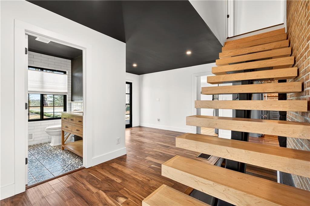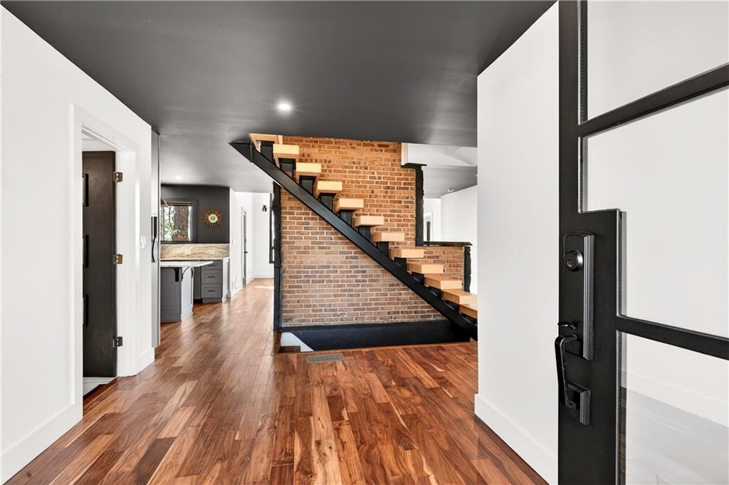 This stunning, fully renovated custom mid-century modern home is truly one of a kind. Imagine sipping your morning coffee or evening cocktails on the expansive back deck while taking in breathtaking sunrise and sunset views of Kennesaw Mountain. Every detail has been thoughtfully curated - from the custom-designed floating staircase to solid marble countertops, gorgeous hardwood floors throughout and stainless steel appliances including a coveted Verona range. From the moment you arrive, you’re greeted by striking steel double front doors that open into a beautiful foyer and an expansive open-concept living space. A dramatic wall of windows floods the home with natural light, creating an airy and inviting atmosphere. In true homage to the home’s architectural roots, the original conversation pit was preserved - the perfect gathering space for cocktails, conversation, movie nights, or entertaining guests. The main-level bath and luxurious primary bath have been beautifully updated with marble countertops, while the primary suite features a spa-like soaking tub. The basement bedroom includes a brand-new, fully renovated full bath and the bedroom opens outside to a new Viking Spa jacuzzi, ideal for relaxing mornings or peaceful evenings outdoors. The carport includes an electric charger. The property sits on over a half acre on a beautifully wooded lot with plenty of space to manicure or enjoy naturally. Part of the expansive lot is equipped with an electric fence (currently shut off) for pet safety. Don’t miss the large vegetable garden to the left of the driveway and the secondary driveway with cantilever gate for additional vehicle or boat storage at the front right corner of the property. An entertainer’s dream, this stunner is ideally located close to shopping, Downtown Woodstock restaurants and easy interstate access. Photos are virtually staged. Don’t miss this rare opportunity to own a truly one-of-a-kind mid-century modern masterpiece.
